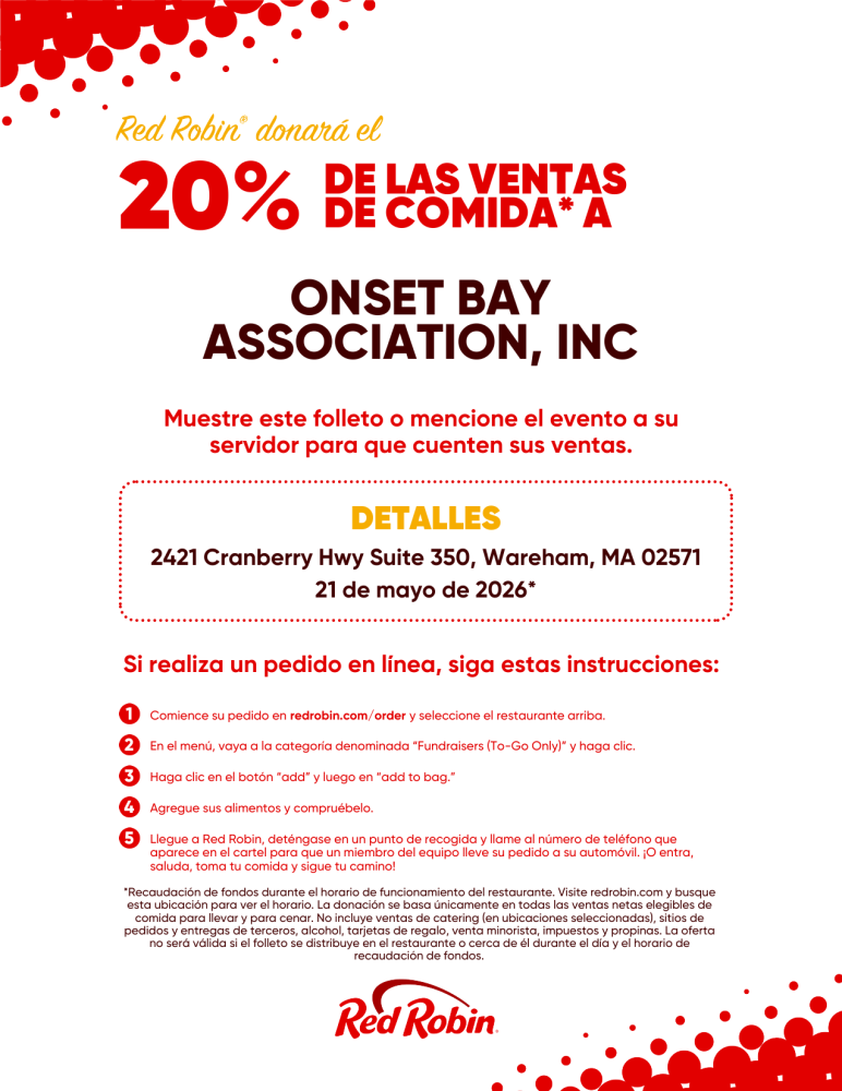 Red Robin Gourmet Burgers in Wareham will be donating 20% of sales on Thursday, May 21, 2026, from 11 a.m. - 9 p.m. to the Onset Bay Association! Please mention this when ordering, whether dining in or taking it to-go. Red Robin is located at Wareham Crossing, 2421 Cranberry Highway, Wareham, MA. The OBA-Onset Bay Association, is a nonprofit organization based in Onset since 1992. We host a full calendar of free/low cost community events and Beautification projects year-round. Learn more about the Onset Bay Association here >OnsetBay.org. onsetvillage@gmail.com. You can also visit us at our headquarters located at 196 Onset Ave, open Tuesday, Thursday and Friday, 11:30 a.m. -4:30 p.m.