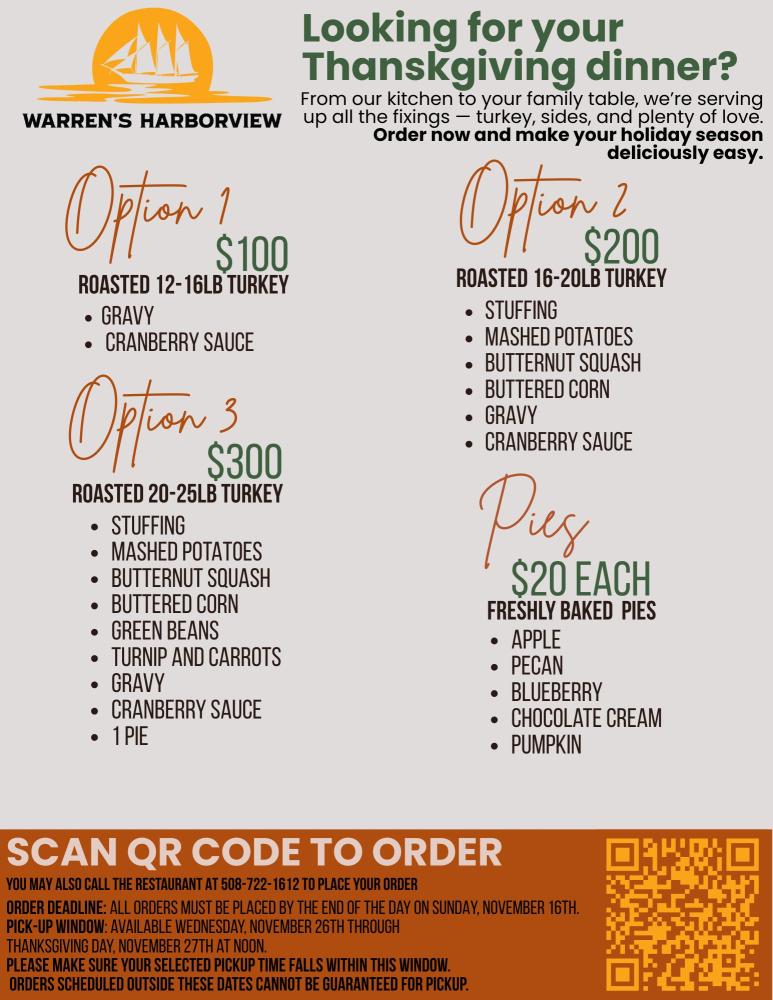 🦃✨ Let us handle Thanksgiving this year! Our Thanksgiving Dinners To-Go are now available for pre-order — enjoy a chef-prepared holiday meal without the stress. 📅 Order Deadline: November 16th (end of day) 🕓 Pickup Window: November 26th–27th (until NOON Thanksgiving Day) 📍 Order Online: https://www.toasttab.com/catering/warrens-harbor-view OR by going to our website on our catering page listed under our events tab https://www.warrensharborview.com/blank-1/catering You may also contact the restaurant at (508)-722-1612 to put in your order over the phone ⚠️ Please make sure your selected pickup time falls within the window above — orders outside these dates cannot be guaranteed for pickup.