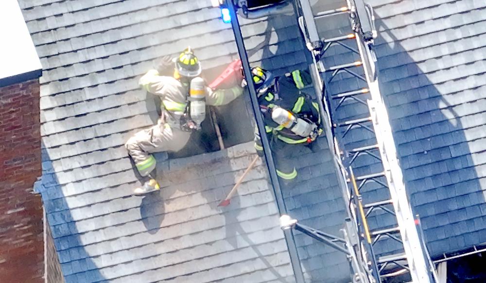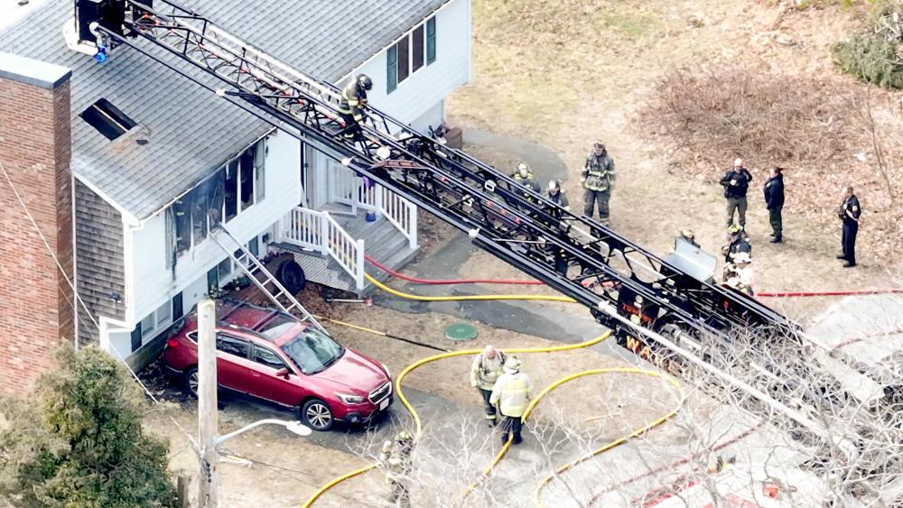 A firefighter nearly fell through a roof in the afternoon of Friday, March 20 while battling a two-alarm house fire on Dusty Lane in Onset.