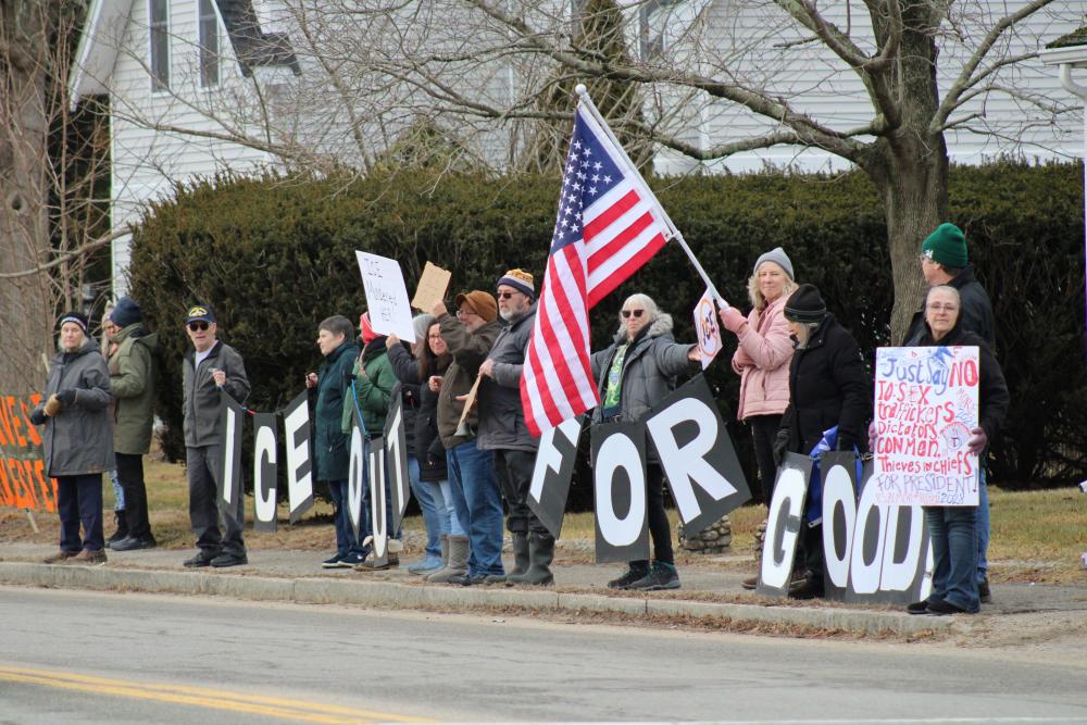 Signs in hand and chants flowing down Marion Road, the usual Saturday morning protest organized by Wareham for Law and Democracy had a relevant theme Jan. 10. With signs like "melt ICE," the sidewalks in front of Town Hall echoed sentiments from the Midwest.