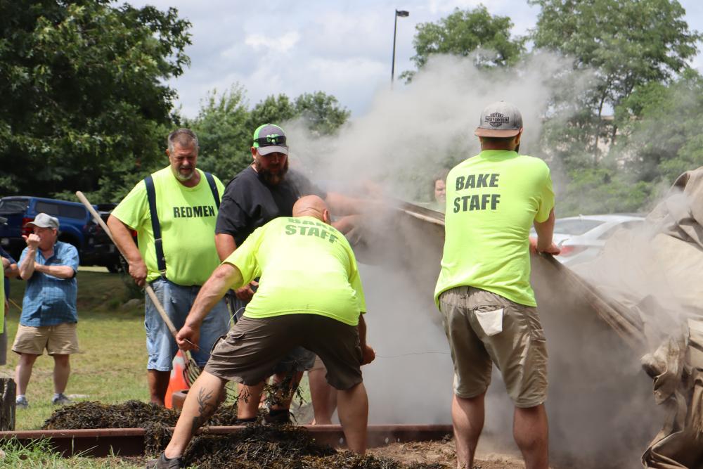 Redman Jay Maloney said the rocks split apart from the heat, necessitating the order clear out the baking pit and search its surroundings for new stones every year. The steel ingots don’t have that issue, he said, and so can be reused year-in, year-out.