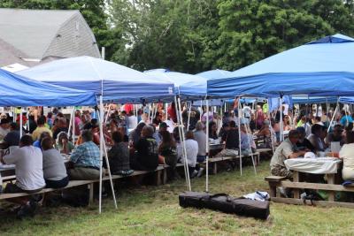 All the ingredients put together give the bake a unique flavor. As the clams, hot dogs, potatoes, corn and fish baked away under the tarps, people crowded picnic tables under tents with their appetites ready.