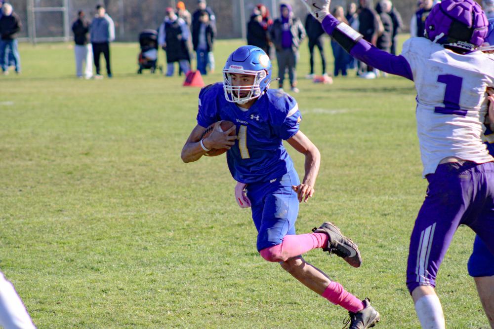 Amare Rose runs for the endzone, avoiding a tackle.The Wareham Viking’s football team brought it all to the turf when they took to Spillane Field one last time this season in the 92nd Thanksgiving rivalry game.