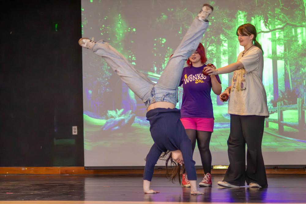 Bria Pavlisko as the Scarecrow cartwheels by Zoey Downing, left, and Avery Goodspeed.